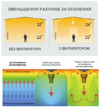 В результаті, під стелею приміщення, або під дахом збирається велика кількість теплого повітря. . Різниця температур між стелею та підлогою може складати до 14С0 . Крім того, виникає велика дельта між зовнішньою та внутрішньою температурою повітря. Що сприяє більшим втратам тепла через дах. Для запобігання цьому, в більшості країн почали використовувати дестратифікатори.