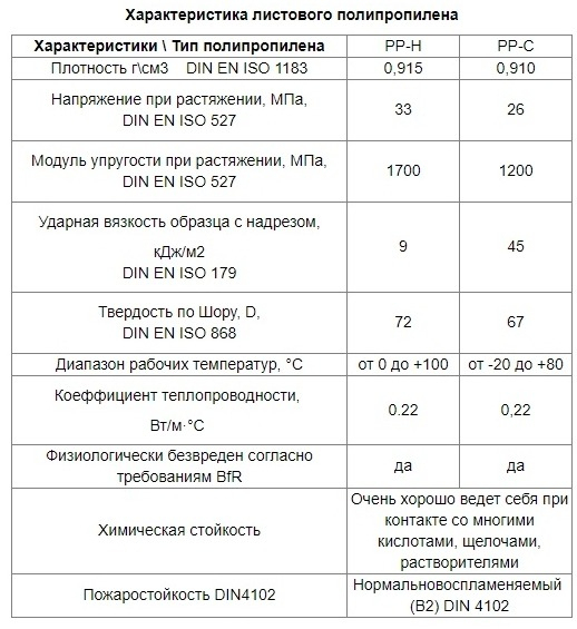 Фізичні властивості поліпропілену на прикладі гомополимера PP-H AlphaPlus і сополимера PP-С німецького виробника Simona AG представлені в таблиці: