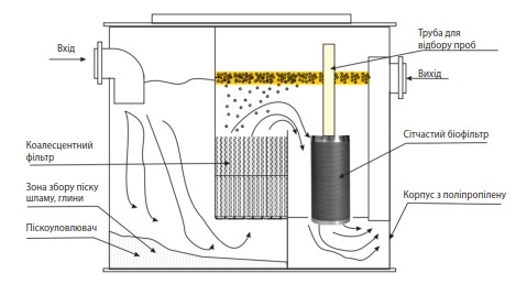 Стічні води (емульсія) в яких знаходяться нафтопродукти та інші тверді за-бруднення (пісок, глина, пилюка) на першому етапі потрапляють в піскоуловлю-вач. Тут відбувається відстоювання з подальшим випаданням в осад глини, піску та грубих фракцій.