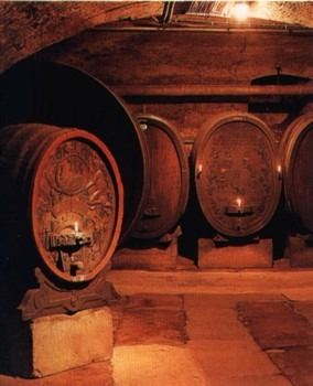 Дубовые бочки для хранения вина в подвалах старинных замков Франции и на современном винном заводе.