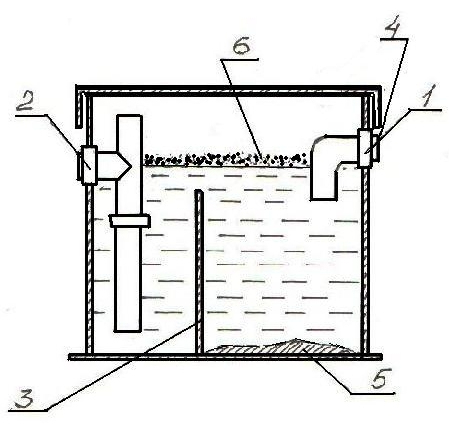 Жир накопичується на поверхні води (6). Зважені частинки опускаються в резервуар для осаду (5). Далі очищена вода через випускний патрубок (2) потрапляє в систему каналізації. Для усунення неприємного запаху і провітрювання, побутової Жироуловитель під мийкою бажано підключати через вентиляційний патрубок (4) до системи вентиляції приміщення.